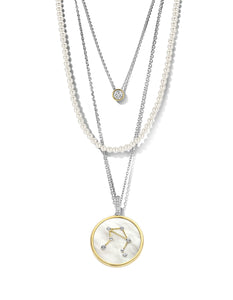 The collection consists 12 zodiac sign necklaces, each showcasing the intricate constellations on a luxurious silver pendant with a captivating mother of pearl inlay