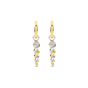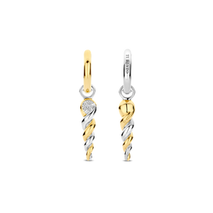 These TI SENTO Gold-Plated Twisted Drop Earrings 78020ZY are a statement of fluid elegance and bold contrast. Crafted from premium 925 sterling silver, these striking drops feature a twisted helix design, seamlessly blending yellow gold plating with sleek sterling silver. A pavé-set cubic zirconia accent at the top adds a hint of brilliance, capturing the light with every move. Suspended from chic gold-plated huggie hoops, these earrings exude an effortless balance of modern glamour and sculptural artistry. Their dynamic silhouette makes them the perfect companion for both casual styling and elevated evening looks. Nickel-free and hypoallergenic, they promise luxurious comfort with every wear. Let these twisted drops be a reflection of bold sophistication and artistic beauty, bringing movement and shine to your every step.