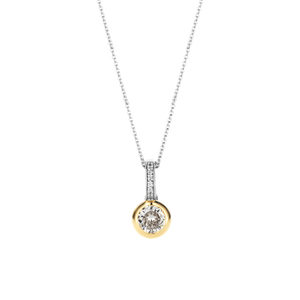 This silver TI SENTO pendant has a large zirconia in the middle, set in a smooth setting that is yellow gold plated with yellow gold. The eye of the pendant is set with smaller brilliant cut zirconias that give the pendant a glamourous appeal and create even more sparkle. The eye of the pendant has a so-called clip-eye - the eye can be clicked open and closed, making it easy to change the pendant or wear it on a necklace with a larger clip ring.