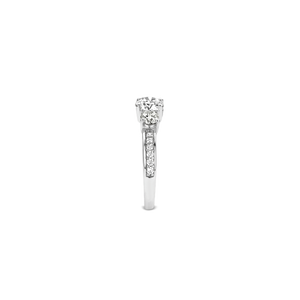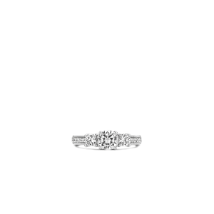 This stylish TI SENTO ring is made from rhodium-plated sterling silver. The rhodium finish gives this piece of jewellery extra shine and also makes it more durable. Three brilliant zirconia cut stones have been placed on the band, which is also decorated with a line of the same diamond-shaped zirconias. This ring has been crafted in a classic Milanese style and it forms a staple item of jewellery that will match any outfit and can be worn for any occasion.
