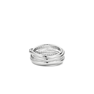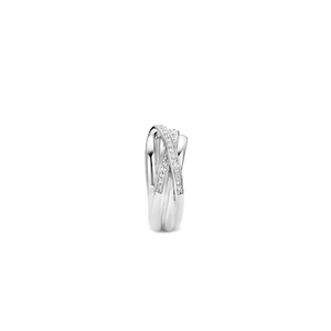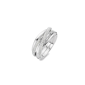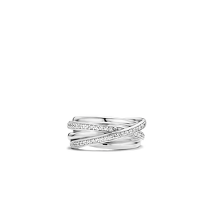 This elegant TI SENTO ring is made from several layers of rhodium sterling silver and an upper layer that is accentuated with cubic zirconia. Between each layer, enough space is left open to see the wearer's skin, creating a playful and seductive look. This is part of a collection with many different items of jewellery, and you can mix & match them to find the right combination.
